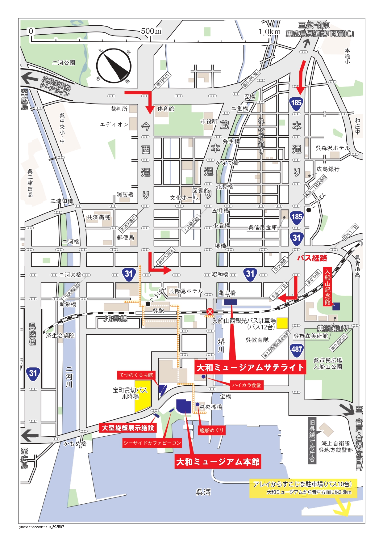 山陽自動車道廿日市IC→国道2号(西広島バイパス)→商工センター→広島高速3号線観音IC→仁保JCT→広島呉道路(クレアライン)→呉IC→大和ミュージアムサテライト/大和ミュージアム