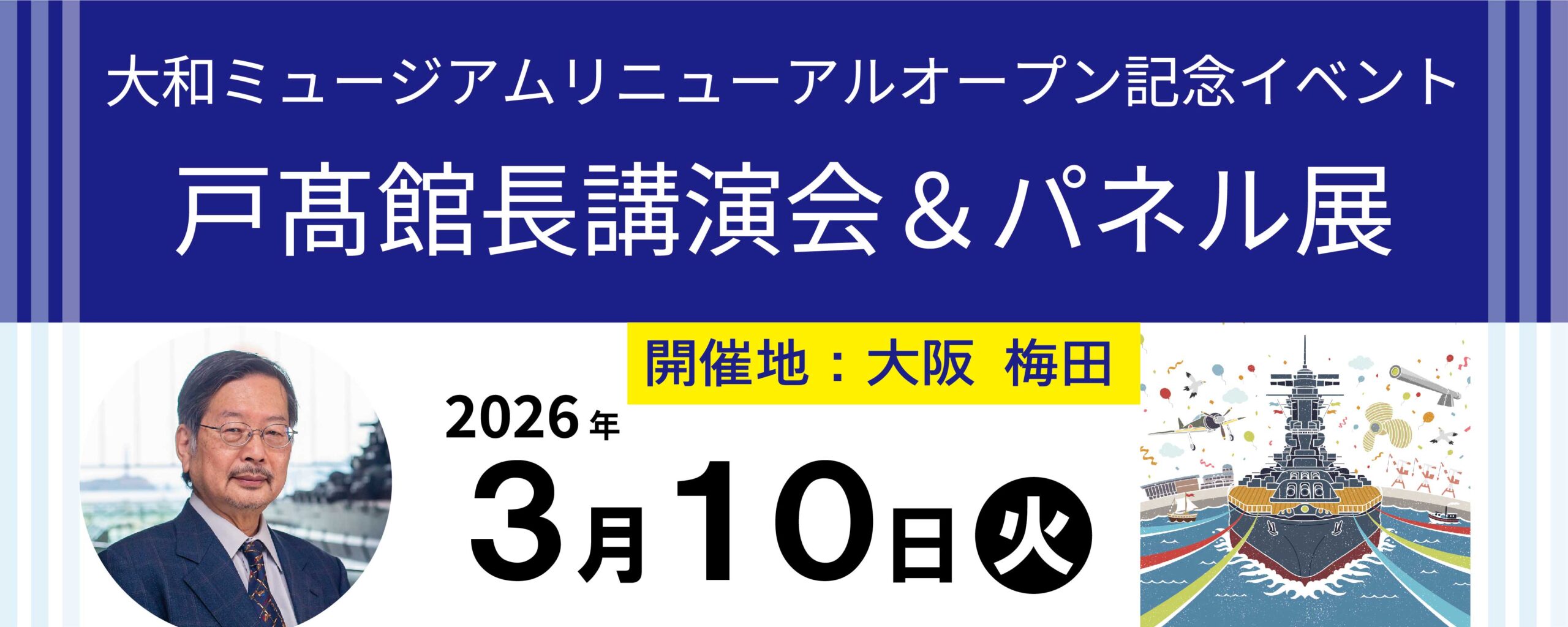 戸髙一成館長の講演会や、新しくなったミュージアムを先行してお見せするパネル展示、世界最小(当館調べ)と話題になった100万分の1戦艦「大和」などもやってきます。