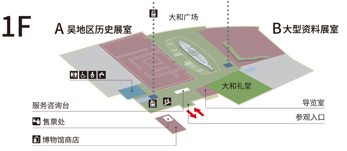 博物馆外入口处前方设有“大和博物馆商店”,不仅提供与“大和号”战列舰相关的书籍、模型以及展览特色文创品,更汇集了吴市本土的特色点心。该区域同时设有大和博物馆的售票处及周边观光资讯服务台,堪称整个大和博物馆的“迎宾处”。
